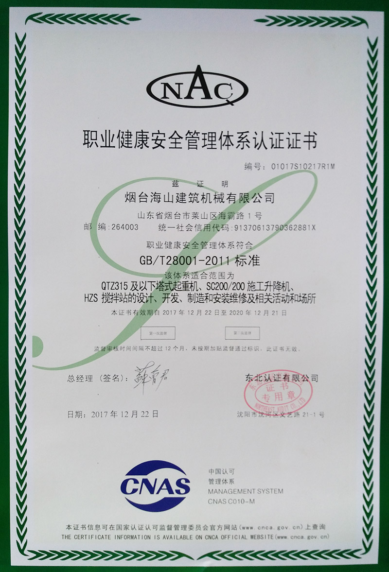 職業健康安全管理體系認證證書